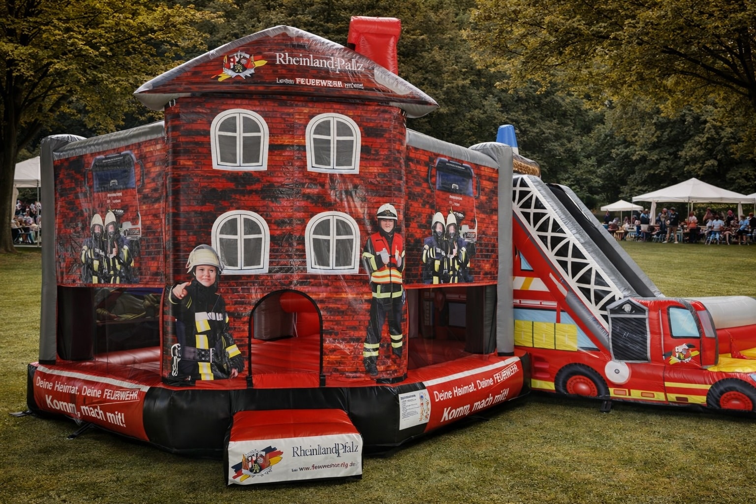 Die Feuerwehr Hüpfburg ist sowohl mit, als auch ohne Logo der Feuerwehr Rheinland- Pfalz erhältlich.